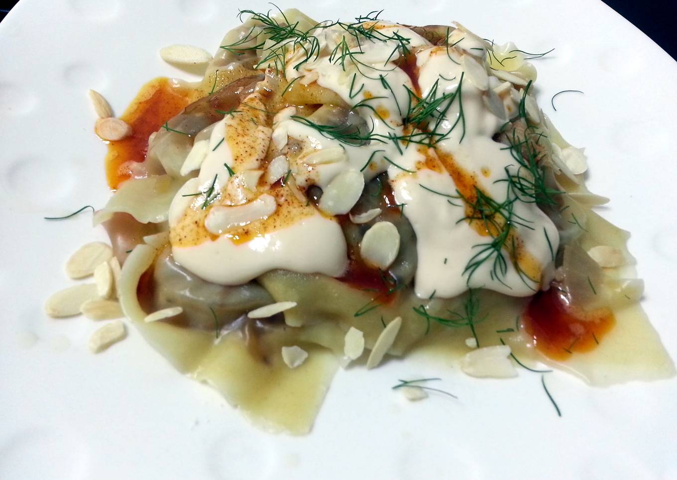 - serve ravioli top garlic alfredo sauce then brown butter top almond and dill