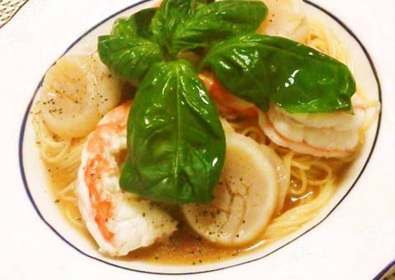 - Place the shrimp and scallops from Step 4 onto the Step 6 pasta and sprinkle with black pepper.