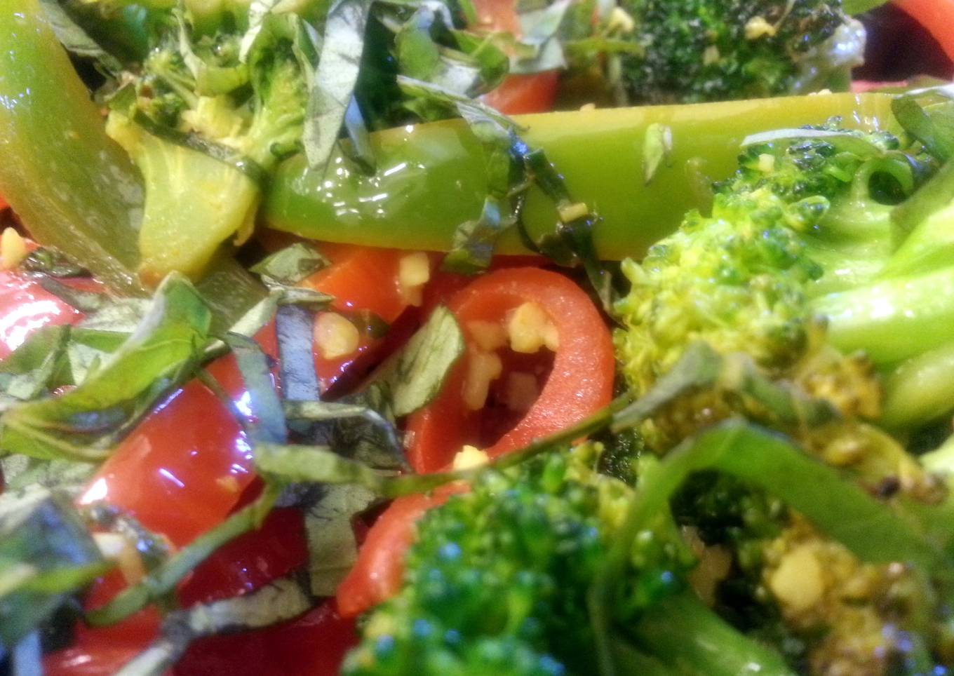 - Heat oil in a large saute pan. Add peppers. Saute on medium-low heat for approximately 5-10 minutes or until peppers are tender. Add garlic. Saute until fragrant. Add broccoli. Add dried spices. Toss. Cook until broccoli is tender. Add basil. Toss. Serve.