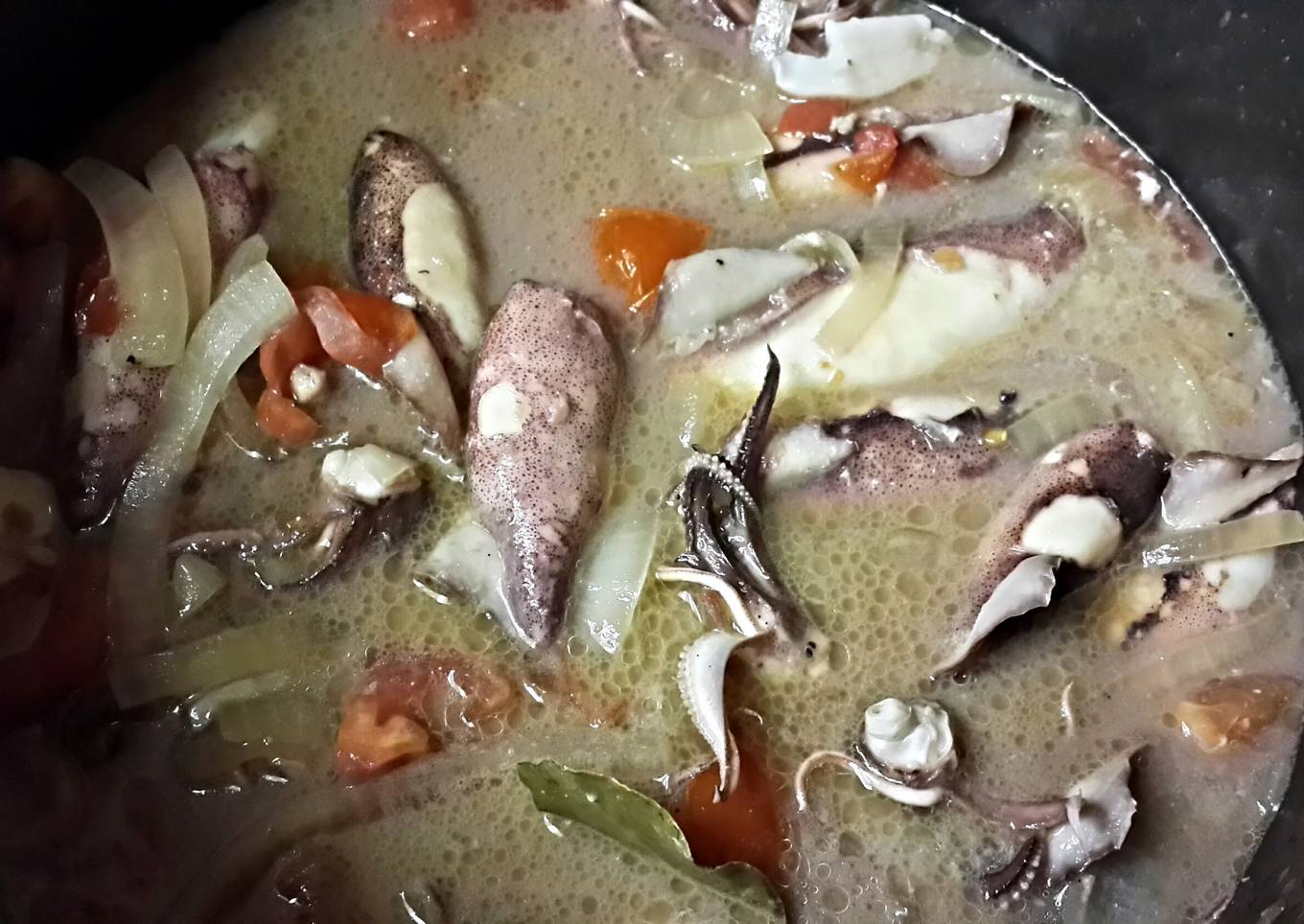 - Pour the reserved liquid over the squid, and simmer for 5 minutes.